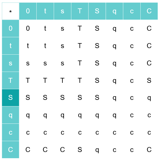 And now, the food type set is F = {0,t,s,T,S,q,c,C}. So, keep those labels in mind moving forward. Instead of Sandwich ⊕Toast, we have s⊕t, which is a lot more convenient to write in my opinion.