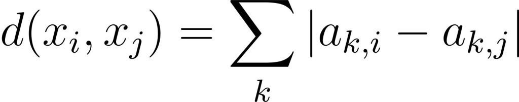 Of course, the distance between points in the coordinate space is straight forward, just use your regular euclidean metric. But in the proposition space things are a bit murkier because of the whole agreement being a categorical variable, not a numerical one. However, as we have seen with the vector representation, because agreement in this test is an ordered variable, we can use a distance measure that counts steps, like Manhattan distance, defined as follows