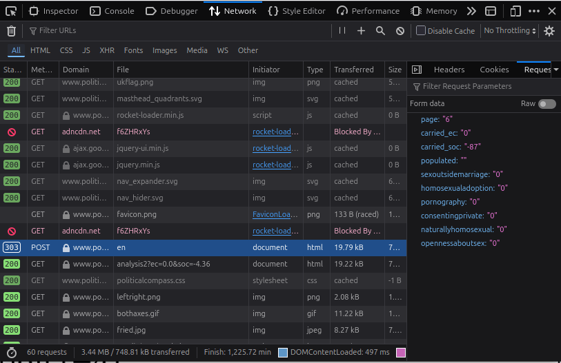 Now I will be focusing on the “strongly disagree” point. There is something else I am interested in clarifying. Whether each proposition is scored independently, and if the propositions have a score in a single axis or on both axis. And for this, we will use the six propositions of the last part of the test, which looks at statements concerning sexuality. Using DevTools in any particular browser, we can see that all propositions are linked to variables. In Firefox, the browser I used, you had to go to network, and then select the last POST method transferred, and look at the Request section: