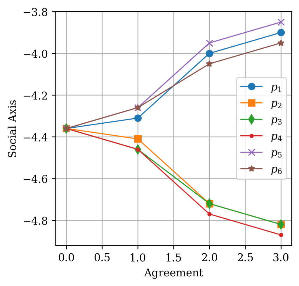 We can see according to these images the following observations. Going from “Strongly x” to “Slightly x” only shifts the coordinate by at most ± 0.1. But between the “Agree” and “Disagree” choices, the jump is larger. At least, variation in function of agreement is monotonic.